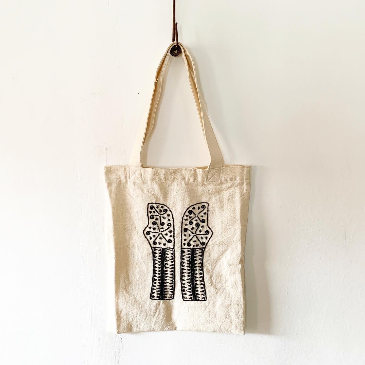 レンテン族の靴をモチーフにした刺繍の入った、トートバッグ。